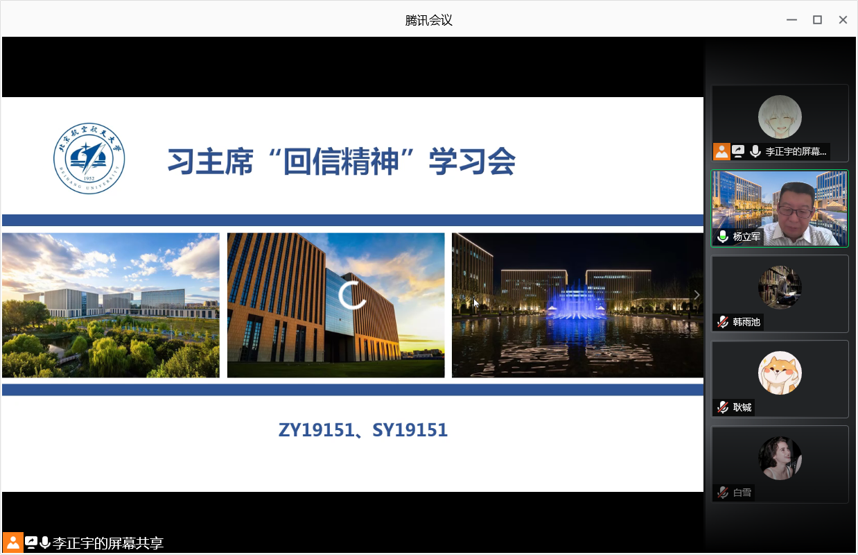 2020年7月10日晚,宇航学院SY19151班与ZY191151班通过腾讯会议的方式,共同开展“关于习近平总书记7月7日给中国石油大学(北京)克拉玛依校区毕业生回信”的学习会活动,特别邀请到宇航学院院长杨立军老师出席会议。本次活动由李正宇主持,参会人数共计51人。